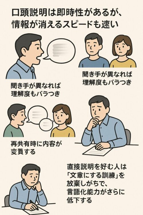 口頭説明は即時性があるが、情報が消えるスピードも速い。聞き手が異なれば理解度もバラつき、再共有時に内容が変質する。さらに、直接説明を好む人は「文章にする訓練」を放棄しがちで、言語化能力がさらに低下する。結果として組織内のドキュメント文化が育たず、属人的な業務体質を助長する。