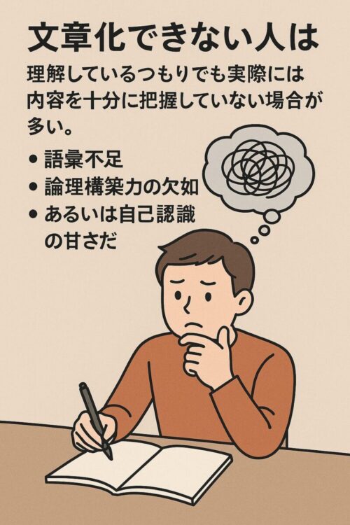 文章化できない人は、理解しているつもりでも実際には内容を十分に把握していない場合が多い。理由は語彙不足、論理構築力の欠如、あるいは自己認識の甘さだ。