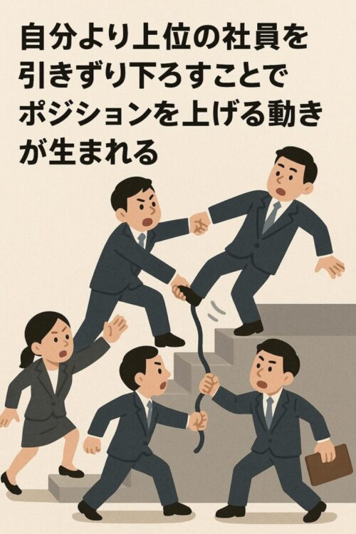 人と人を比較して順位付けすれば、社員はその序列を意識せざるを得ない。評価や給与に直結するなら、無関心ではいられない。結果として、自分より上位の社員を引きずり下ろすことでポジションを上げる動きが生まれる。