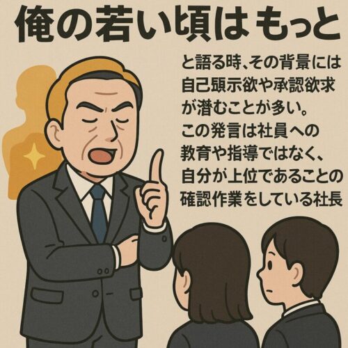経営者が「俺の若い頃はもっと…」と語る時、その背景には自己顕示欲や承認欲求が潜むことが多い。この発言は社員への教育や指導ではなく、自分が上位であることの確認作業に過ぎない。