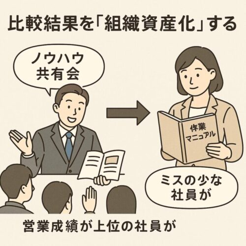 自分の成長やスキルアップは、周囲を助ける力に転換すべきだ。知識や経験を共有し、他者の成長を支援する文化を作ることで、組織全体の底上げが可能になる。例えば、営業成績が上位の社員がノウハウ共有会を開く、ミスの少ない社員が作業マニュアルを整備するなど、比較結果を「組織資産化」することが重要だ。