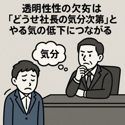 規則や評価基準があっても、最終決裁者が「なんとなくの印象」で査定を変えるなら、それは制度崩壊である。「あいつよりこいつの方が…」という感覚任せの査定は、社員の信頼を失い、退職や士気低下を招く。