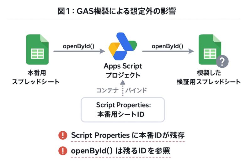 GASでは ScriptProperties に格納されたIDや設定値がコピーしても維持される。つまり、スプレッドシートとスクリプトを同時にコピーしても、スクリプト内のプロパティやコード中に埋め込まれたIDが更新されなければ、参照先は依然として本番環境のままなのだ。