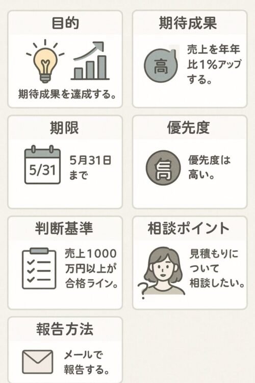 【目的/期待成果/期限/優先度/判断基準/相談ポイント/報告方法】