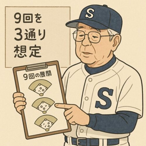 名将・野村克也氏は、「9回の試合展開を3通り想定しておく」ことを監督としての鉄則としていた。点を取られたパターン、競ったままのパターン、自分たちがリードしているパターン…。これらをすべて想定し、その上で采配を振るうからこそ、試合中にブレない判断ができたのである。